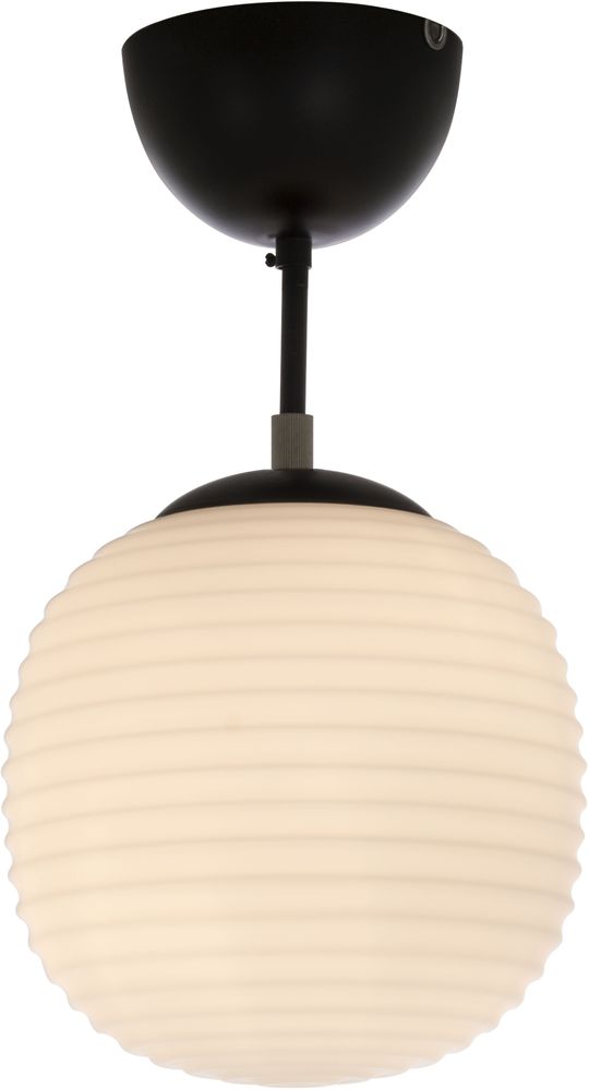 Plafondlamp in zwart metaal en opaalwit glas. Makkelijk aan het plafond te hangen.
