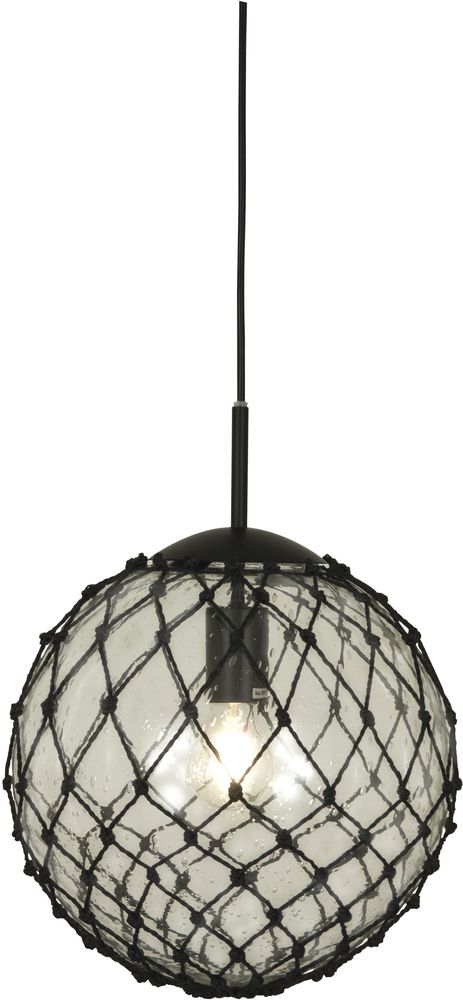 Plafondlamp van zwart metaal en helder glas, met details van zwart touw. Eenvoudige plafondophanging.