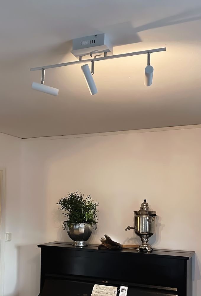Schijnwerper in wit en verchroomd metaal. Eenvoudig aan het plafond te monteren.
