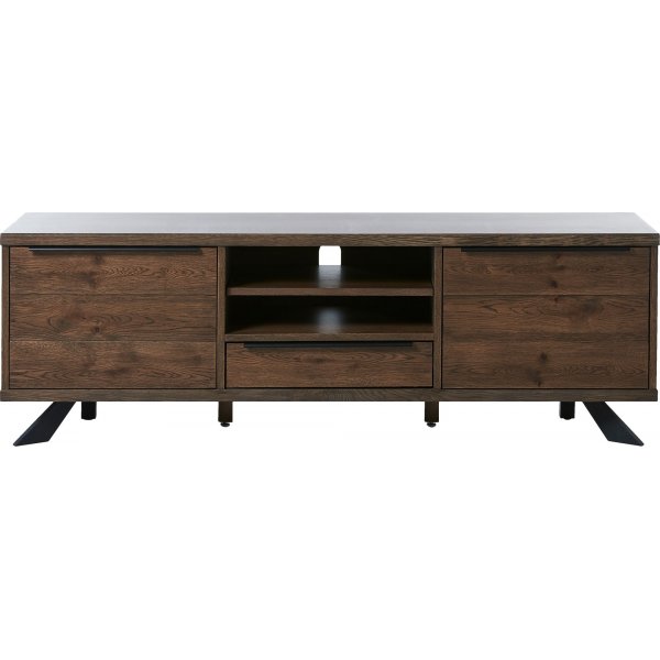 Sky tv-meubel in gerookt eikenhout, breedte 170 cm. Twee deuren, een opbergkist en open opbergruimte.