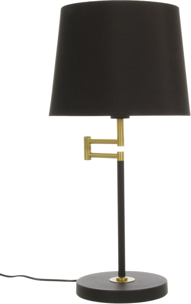 Metalen tafellamp met zwarte en mat messing afwerking. Textiele lampenkap inbegrepen.