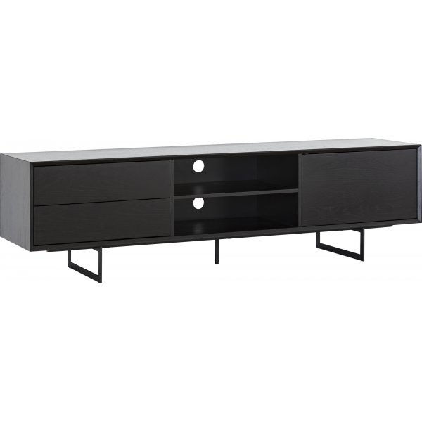 Tv-meubel in zwart gelakt eikenfineer en metalen onderstel. Een kast, twee lades en twee planken met voorgeboorde kabelgaten.